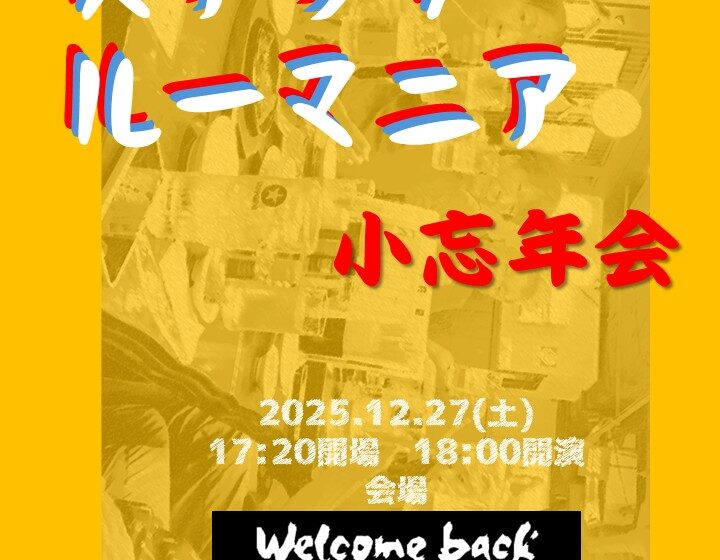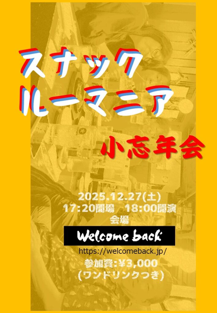 2025年12月27日(Sat) スナックルーマニア 小忘年会 12月 27 Sat 2025 ライブ 開場:17:20 / 開演:18:00 MC ¥3,000 / 1ドリンク込み 出演:スナックルーマニア 2025.12.27(土) スナックルーマニア 小忘年会 OPEN 17:20 / START 18:00 MC ¥3,000-(1ドリンク込み) 出演:スナックルーマニア 前のスケジュール 次のスケジュール