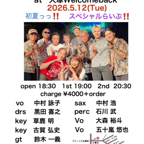 出演:Vo:中村 詠子/Sax:中村 浩/Drs:黒田 喜之/Key:草鹿明/Key:古賀 弘史/Gt:鈴木 一義/Ba:栗山宜幸/Per:石川武/Vo:大森裕斗/Vo:五十嵐悠也