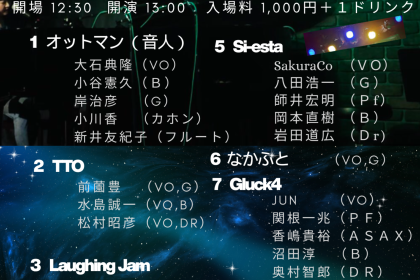 出演:オットマン(音人) / TTO / Laughing Jam / 大石薫 / Si-esta / なかふと / Gluck4 / 大賀誠司 / 東京ホッとブラザーズ
